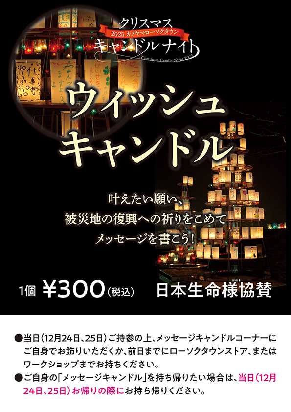 ローソクタウンストアおよびワークショップの年内営業は、12月28日(日)までとさせていただきます。新年は1月2日(金)より営業を再開いたします。また、工場見学は12月26日(金)までとし、年始は1月6日(火)より再開いたします。