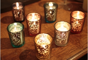 シャビーな加工で、ホルダーの側面からはあかりの搖らぎが見え隠れし、幻想的な雰囲気を醸し出します。キャンドルのあかりと持つ温かみと、ヴィンテージホルダーが持つメタリックなキラキラ感が重なり輝きを放つアイテムです。
